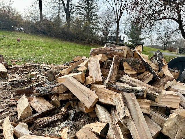 Thankfully, we have an abundance of standing firewood on and around our property. So we don’t have to go far to source it. The Emerald Ash Borer has been wreaking havoc on the ash tree population here in the Northeast for decades, leaving the carcasses of these once-majestic hardwoods standing and good for only one thing—firewood. Even that’s a gamble, though. The longer they stand, the punkier they get, so the grade varies wildly. But it will all burn, and we’re not picky. It all has to come down anyway.